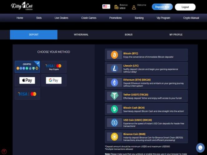 If you’re not very familiar with making crypto deposits, make sure you check the Crypto Manual section, where all steps of this process are simply described and explained in the best possible way how you can effortlessly make crypto transactions at Kitty Cat Casino.