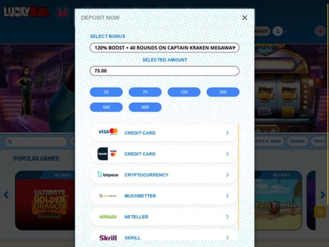 Lucky Bull Casino offers games from the following software providers: Microgaming, NetEnt, Evolution Gaming, Betsoft, Pragmatic Play, Play n’Go, BTG, Quickspin, ELK, Red Tiger, Thunderkick, Rabcat, Playson, Lightning Box, 1x2 Gaming, Isoftbet, JFTW, Booming Games, Wazdan, Foxium, 2by2 Gaming, Triple Edge Studios, Push Gaming, Relax Gaming, Genesis Gaming, Fantasma Games, Kalamba, Gameburger Studios, All41 Studios, Stormcraft Studios, Fortune Factory Studios, Slingshot Studios, Crazy Tooth Studio, Gamomat, Neon Valley Studios, Skilzz Gaming, Red Rake, Oryx, 4ThePlayer, Golden Rock Studios, Ainsworth, Northern Lights Gaming, Eurostar Studios, Alchemy Gaming, Gamevy, Hacksaw Gaming, Electric Elephant Games, SilverBack Gaming, Max Win Gaming, STHLM Gaming, Golden Hero, Snowborn Games, Gold Coin Studios, Skywind, Wild Streak Gaming, Dreamtech Gaming, Aurum Signature Studios, Swintt, Storm Gaming Technology, Peter & Sons, Spin Games.
