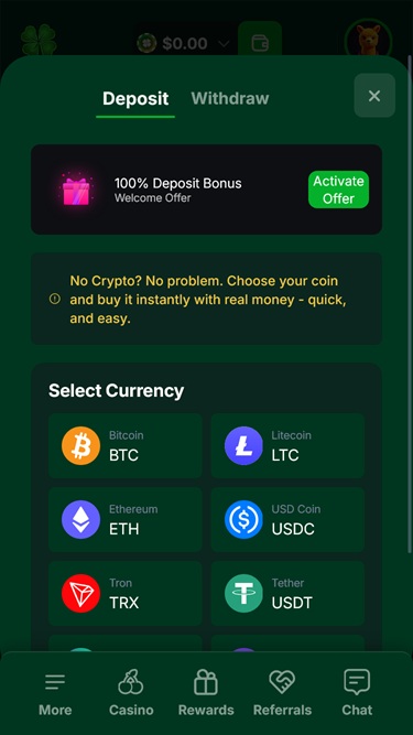 Instead, players can deposit and withdraw using several cryptocurrencies, including Bitcoin, Ethereum, Litecoin, Solana, Tron, USD Coin, and Tether.