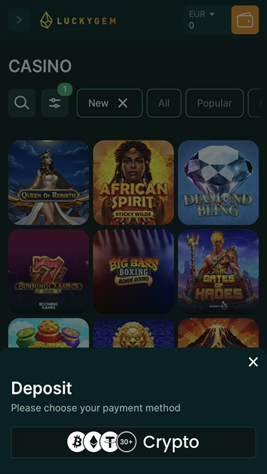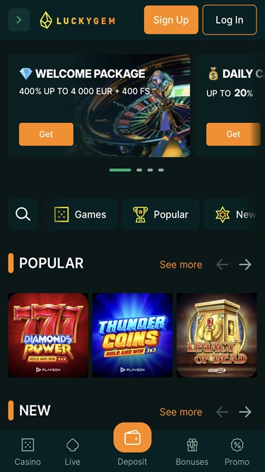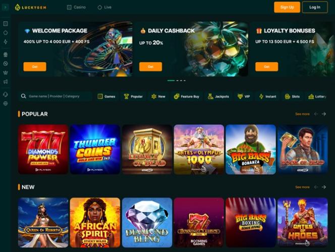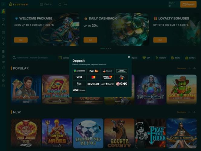 LuckyGem is a massive online casino that primarily welcomes players from the Netherlands, and promises to provide them with an unforgettable gambling experience by provding them with a competent library of online slots, live dealers, table games, crash games, and lotteries, all while featuring an extensive lineup of promotions and bonuses, as well as crypto availability.
