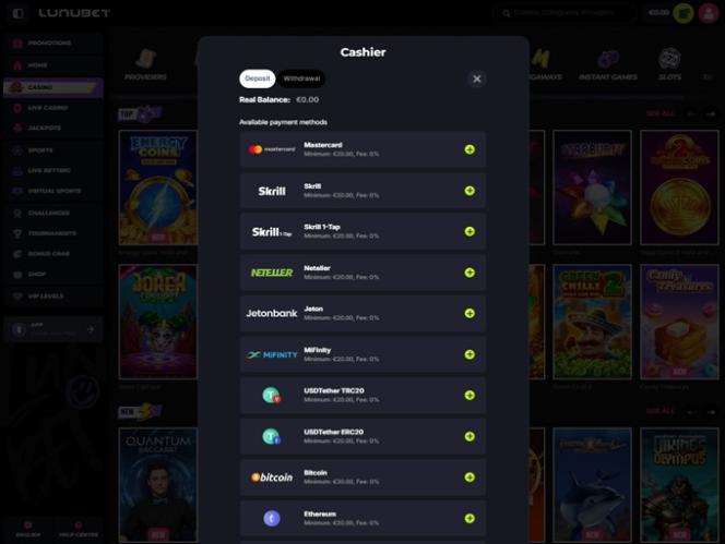 Lunubet Casino offers an excellent range of traditional and crypto payments, catering to players worldwide with a wide array of available currencies. For those interested in cryptocurrency, available options include BTC, DOGE, ETH, LTC, SOL, TRX, USDC, USDT, and more.