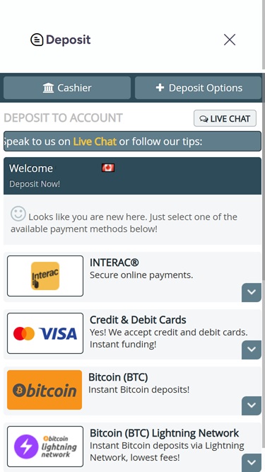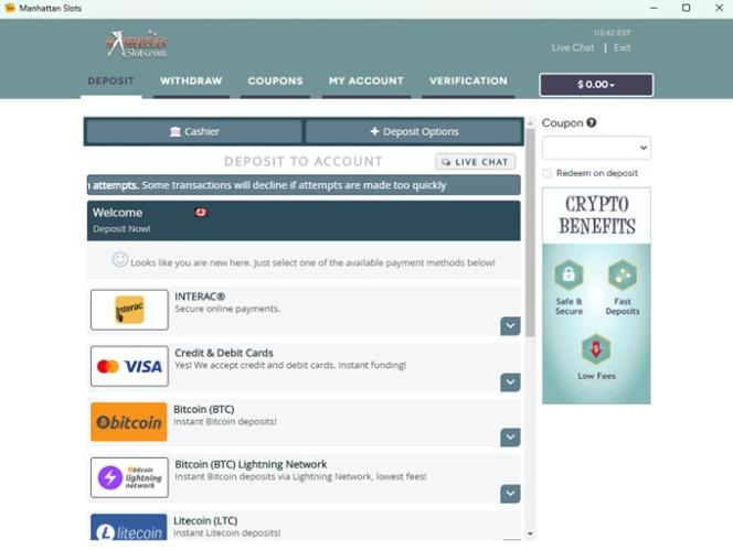 Banking options at Manhattan Slots