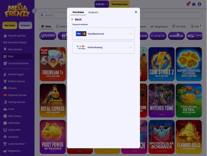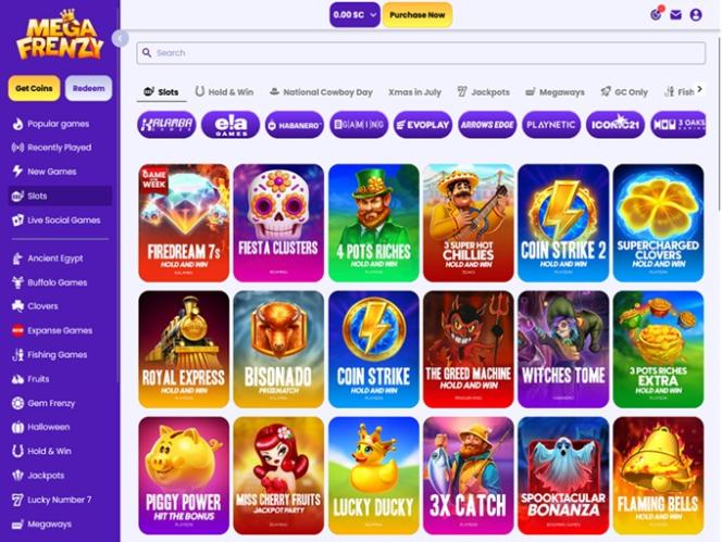 Just like at any other modern sweepstakes casino, Mega Frenzy also features an extensive selection of casino-style slots for you to dive into. The library features all the major categories and genres, including Megaways slots, old-school releases, the newest additions, jackpots, fishing slots, and more.