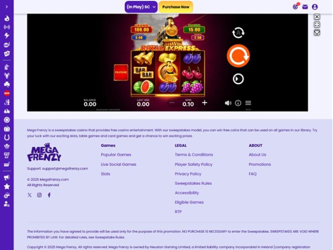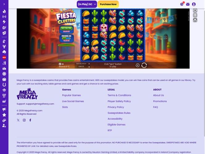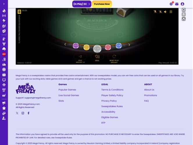 Established in 2025, Mega Frenzy Casino is a massive sweepstakes casino offering a wide range of gaming options: you’ll love it if you enjoy innovative slots like Megaways and even live dealers like Gravity Blackjack and Sic Bo. The brand accepts players from the United States (certain states excluded) and offers a comprehensive selection of casino-style online slots and live dealer games, along with a robust promotional program featuring bonuses, events, and numerous other rewards.