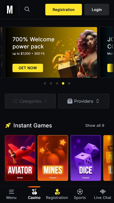 Instant games fans will have at their disposal a large number of trendy titles such as Aviator, Vortex, Turboplinko, JetX, Mines, Mines, Plinko, Aviamasters, Goal, Hilo, Hotline, Keno, Dice, Stairs, Limbo Rider, Fruit Towers, Aero, Multiplayer Mines, Save the Princess, Book of Mines, Donny King, PumpedX, Hamsta, Double Roll, Dice Thrice, Crash X Football, Towers, 1Tap Mines, Plinko, Minesweeper, Minesweeper XY, Dice Twice, Magic Keno, Neko, New, Jewel Clicker, Turbomines…
