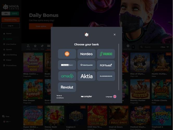 Ninja Casino does not accept players from the following countries: Afghanistan, Alabama, Aland Islands, Alaska, Albania, Alberta, Alderney, Algeria, American Samoa, Andorra, Angola, Anguilla, Antarctica, Antigua and Barbuda, Argentina, Arizona, Arkansas, Armenia, Aruba, Australia, Austria, Azerbaijan, Bahamas, Bahrain, Bangladesh, Barbados, Belarus, Belgium, Belize, Benin, Bermuda, Bhutan, Bolivia, Bosnia and Herzegovina, Botswana, Bouvet Island, Brazil, British Columbia, British Indian Ocean Territory, Brunei, Bulgaria, Burkina Faso, Burundi, California, Cambodia, Cameroon, Canada, Cape Verde, Cayman Islands, Central African Republic, Chad, Chile, China, Christmas Island, Cocos (Keeling) Islands, Colombia, Colorado, Comoros, Congo, Congo Democratic Republic, Connecticut, Cook Islands, Costa Rica, Cote d'Ivoire, Croatia, Cuba, Curacao, Cyprus, Czech Republic, DC, Delaware, Denmark, Djibouti, Dominica, Dominican Republic, Ecuador, Egypt, El Salvador, Equatorial Guinea, Eritrea, Ethiopia, Falkland Islands (Malvinas), Faroe Islands, Fiji, Florida, France, French Guiana, French Polynesia, French Southern Territories, Gabon, Gambia, Georgia, Georgia, Germany, Ghana, Gibraltar, Greece, Greenland, Grenada, Guadeloupe, Guam, Guatemala, Guinea, Guinea-Bissau, Guyana, Haiti, Hawaii, Heard Island and McDonald Islands, Honduras, Hong Kong, Hungary, Iceland, Idaho, Illinois, India, Indiana, Indonesia, Iowa, Iran, Iraq, Ireland, Isle of Man, Israel, Italy, Jamaica, Japan, Jersey, Jordan, Kansas, Kazakhstan, Kentucky, Kenya, Kiribati, Korea, Democratic People's Republic of, Korea, Republic of, Kuwait, Kyrgyzstan, Laos, Latvia, Lebanon, Lesotho, Liberia, Libya, Liechtenstein, Lithuania, Louisiana, Luxembourg, Macau, Madagascar, Maine, Malawi, Malaysia, Maldives, Mali, Malta, Manitoba, Marshall Islands, Martinique, Maryland, Massachusetts, Mauritania, Mauritius, Mayotte, Mexico, Michigan, Micronesia, Federated States of, Minnesota, Mississippi, Missouri, Moldova, Monaco, Mongolia, Montana, Montenegro, Montserrat, Morocco, Mozambique, Myanmar, Namibia, Nauru, Nebraska, Nepal, Netherlands, Netherlands Antilles, Nevada, New Brunswick, New Caledonia, New Hampshire, New Jersey, New Mexico, New York, New Zealand, Newfoundland and Labrador, Nicaragua, Niger, Nigeria, Niue, Norfolk Island, North Carolina, North Dakota, North Macedonia, Northern Mariana Islands, Northwest Territories, Norway, Nova Scotia, Nunavut, Ohio, Oklahoma, Oman, Ontario, Oregon, Pakistan, Palau, Palestine, Panama, Papua New Guinea, Paraguay, Pennsylvania, Peru, Philippines, Pitcairn, Poland, Portugal, Prince Edward Island, Puerto Rico, Qatar, Quebec, Reunion, Rhode Island, Romania, Russia, Rwanda, Saint Helena, Saint Kitts and Nevis, Saint Lucia, Saint Martin, Saint Pierre and Miquelon, Saint Vincent and The Grenadines, Samoa, San Marino, Sao Tome and Principe, Saskatchewan, Saudi Arabia, Senegal, Serbia, Seychelles, Sierra Leone, Singapore, Slovakia, Slovenia, Solomon Islands, Somalia, South Africa, South Carolina, South Dakota, South Georgia and The South Sandwich Islands, South Sudan, Spain, Sri Lanka, Sudan, Suriname, Svalbard and Jan Mayen, Swaziland, Sweden, Switzerland, Syria, Taiwan, Tajikistan, Tanzania, Tennessee, Texas, Thailand, Timor-Leste, Togo, Tokelau, Tonga, Trinidad and Tobago, Tunisia, Turkey, Turkmenistan, Turks and Caicos Islands, Tuvalu, Uganda, Ukraine, United Arab Emirates, United Kingdom, United States, United States Minor Outlying Islands, Uruguay, Utah, Uzbekistan, Vanuatu, Vatican, Venezuela, Vermont, Viet Nam, Virgin Islands, British, Virgin Islands, U.S., Virginia, Wallis and Futuna, Washington, West Virginia, Western Sahara, Wisconsin, Wyoming, Yemen, Yugoslavia, Yukon Territory, Zambia and Zimbabwe.