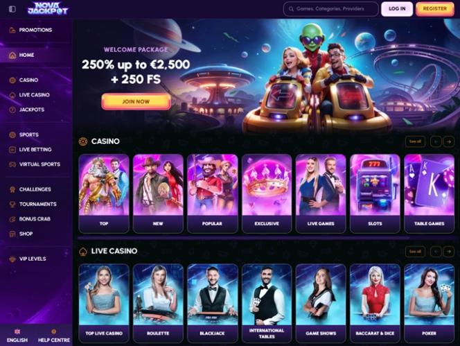 As mentioned earlier, Novajackpot has a modern platform, and its entire content is extremely well-structured. All available games are organized into three sections: Casino, Live Casino, and Jackpots.