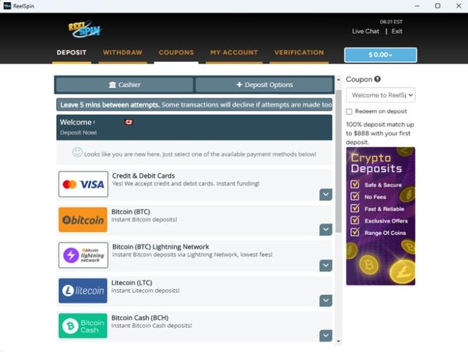 Reel Spin lacks variety in the slots and games. As far as I can tell, they do not offer non deposit bonuses for players to "test the water". They lack good customer service skills as well.