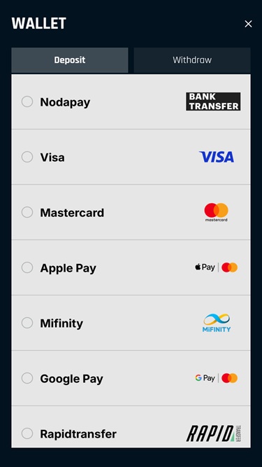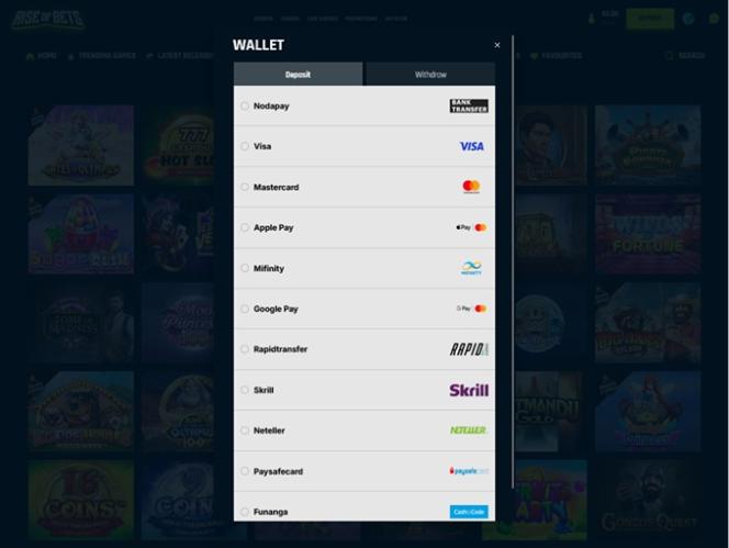 To deposit and withdraw at Rise of Bets Casino, the operator allows players to use numerous banking methods, such as Visa, Mastercard, Jeton, Mifinity, Neteller, Skrill, Paysafecard, Trustly, Payz, and Bank Wire Transfer. Unfortunately, the website doesn't accept cryptocurrencies, so those looking for a crypto experience must look elsewhere.