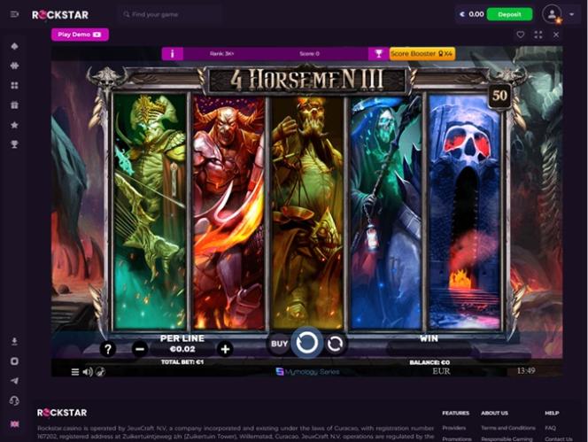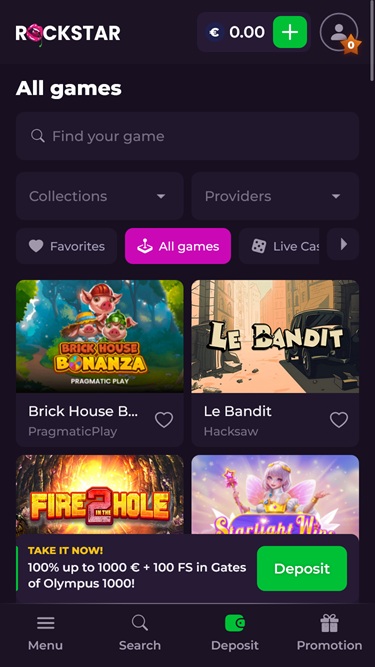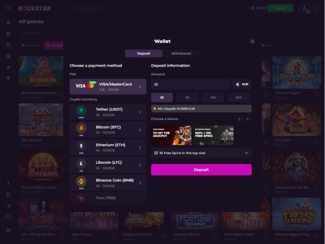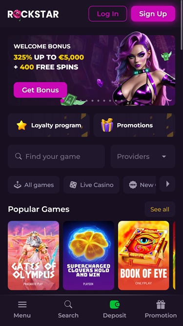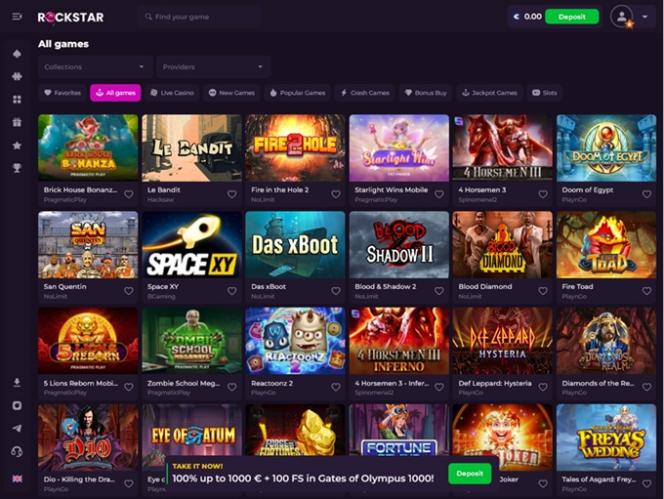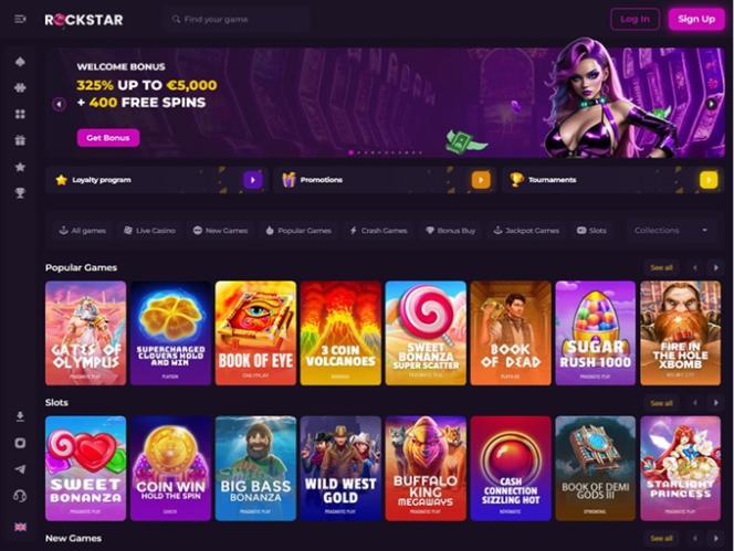Rockstar is a massive online casino welcoming players from Romania, Spain, Portugal, France, Belgium, Italy and Greece. It promises a comprehensive selection of casino games, including real-money slots, live dealers, table games, and instant crash games, along with a stunning promotional plan featuring bonuses, events, and tournaments.