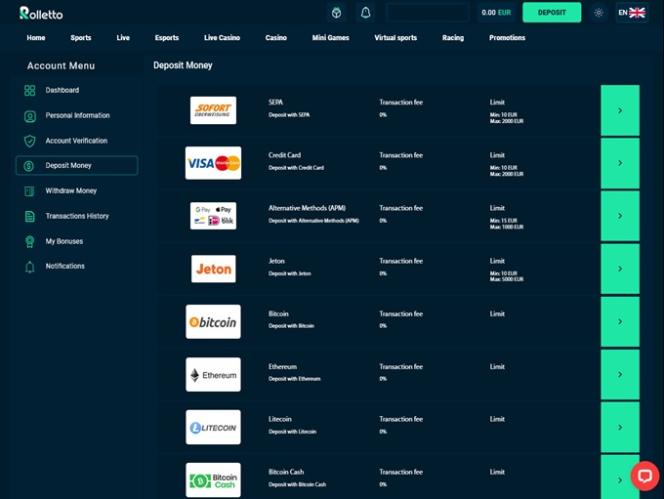 Rolletto Casino allows users to complete transactions with various payment methods. Popular options include Visa, Mastercard, Bank Wire Transfer, Google Pay, Apple Pay, AstroPay, Jeton, Skrill, Neteller, Payz, and Discover, among others. In addition to traditional banking options, the site accepts cryptocurrencies such as Bitcoin, Bitcoin Cash, Dash, Dogecoin, Ethereum, Litecoin, USD Coin, Tether, Monero, and Ripple.