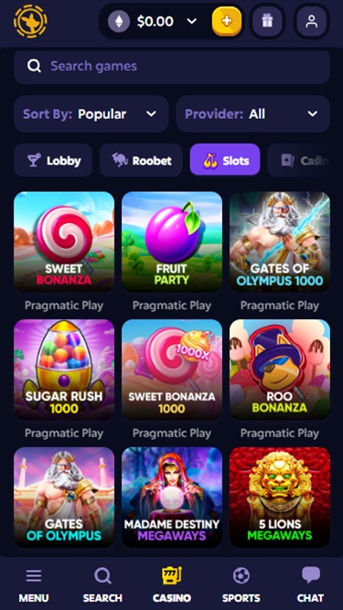 Roobet is a modern online casino that really delivers when it comes to game variety and sports betting. You can enjoy a huge selection of online slots, live dealer, table games, and crash games. The rich sportsbook is where you can bet on a wide range of sports and esports events.