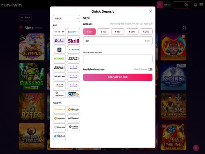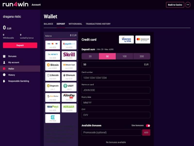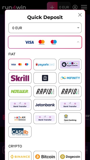 There is a plethora of banking options at Run4Win Casino, with players being able to use cryptocurrencies as their payment method, as well as other popular methods such as Visa, Mastercard, Neteller, Skrill, Bank Wire Transfer, Astropay, and others.