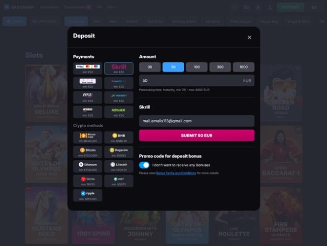 The players that prefer using crypto payment options will be happy to know that SkyCrown allows transactions in various popular cryptocurrencies.