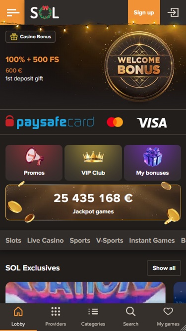 Besides being a next favorite virtual gambling venue for many casino players for its online casino services, we have to mention that this operator provides sports betting as well. With that being said, we will focus on Sol's online casino offer.