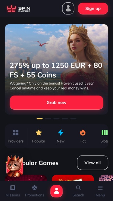 The website is localized into English, Danish, German, French, and Italian. It is responsive and perfectly optimized for gaming on the go from portable devices of all screen sizes. If you prefer desktop computers, you can expect a great experience as well. We are just about to review casino services, so stay tuned, as SpinEmpire has prepared amazing promotional deals, tournaments, a loyalty plan, and much more for its casino members.