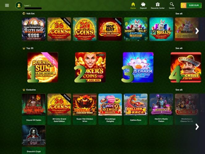 The website welcomes you with a calming green-themed interface that’s easy to navigate. On the left side you will find a menu that allows you to quickly hop between home page, live dealer games, lotto & instant games, rewards center and more info tab. Under the info tab you’ll find terms, privacy policy, responsible gambling section, as well as about us and contact us pages.