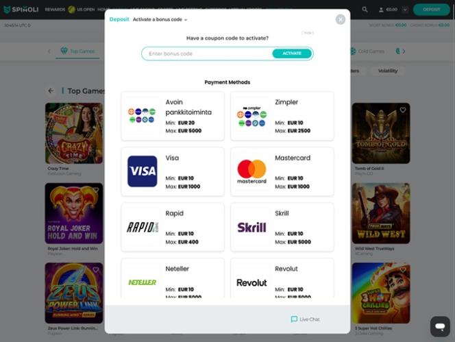 Live casino – Lightning Roulette XXXTreme, Marble Race, Blackjack VIP, Extra Chilli Epic Spins Live, Immersive Roulette, Crazy Balls, Crazy Coin Flip, Funky Time Live, Blackjack Party, Power Blackjack, Lightning Storm, Dead or Alive Saloon Live, Race Track, Lightning Dice, Andar Bahar, Bac Bo Live, Fan Tan Live, 2 Hand Casino Hold’em, Caribbean Stud Poker, Lucky 6.