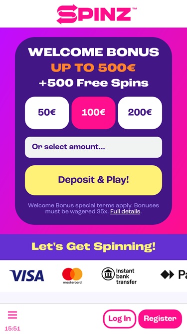 Its light mode user-friendly interface with prevailing bright pink details is optimized for all available devices, no matter their screen size or type. This is a lovely option since punters may enjoy their time spent at Spinz from their desktop station, favorite gaming chair or a couch, or on the go.