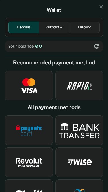 Apart from crypto the casino also operates in fiat currencies such as EUR and Norwegian Krone to name just some and offers payment methods like VISA, Revolut, PaysafeCard and MiFinity among several others.