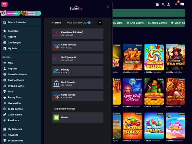 StakeBro is a crypto-friendly online casino operating under Curacao license, featuring an impressive array of casino games. Table games like roulette, baccarat or poker, slots, crash games, live casino games, you name it, it’s there.