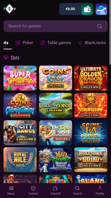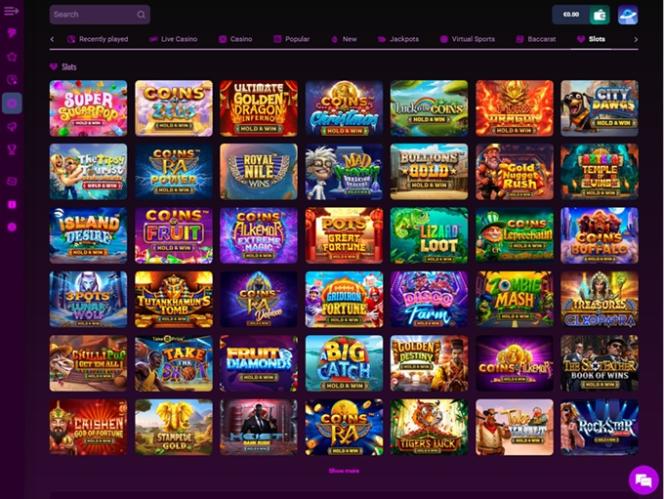 Right off the bat the website greets you with a modern interface allowing for easy navigation across all important parts of the casino. The left side of your screen is reserved for a menu where you will find your real balance, bonus balance, loyalty points and level.
