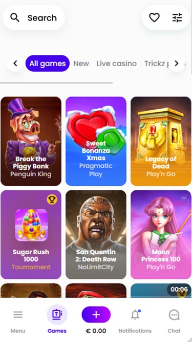Trickz is equipped with an excellent live-dealer section. Here are some of the games included in this section: Crazy Time, Blackjack, Lightning Roulette, Free Bet Blackjack 1, Infinite Blackjack, Immersive Roulette, Monopoly Big Baller, Powerup Roulette, Crazy Coinflip, Sweet Bonanza Candyland, Boom City, Monopoly, Mega Roulette, Mega Wheel, Gold Bar Roulette, Casino Hold’em, Deal or no Deal, Baccarat, Fan Tan, 2 Hand Casino Hold’em, Lightning Dice, Side Bet City, Dragon Tiger, Free Bet Blackjack, Baccarat Control, Gonzo’s Treasure Hunt and more.