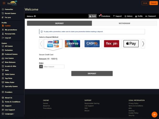Tropica Casino is an online betting site that opened its doors in 2009. It is owned and operated by the Refilliates Group, which also owns Cash o' Lot Casino. Tropica Casino is praised for its fast payments, but also criticized for its low withdrawal limits and limited customer support hours. Recently, it came to our attention that Refilliates has ended their affiliate program abruptly, and has sold this casino to a new group. This comes at the same time that there have been reports of payouts being held, which is inexcusable, and we have taken the step of blacklisting this casino as a result.Casino Info