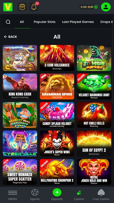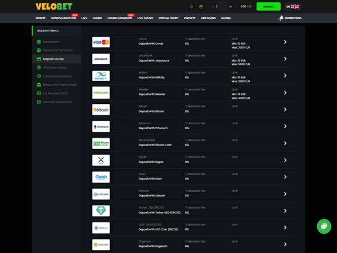 All Velobet’s content is well-structured and organized into the following categories: Sports, Marathon, Live, Casino, Live Casino, Virtual sport, Esports, Mini Games and Racing. From there players can choose their favorite game type and kick back to enjoy the fun and entertainment this online casino offers.
