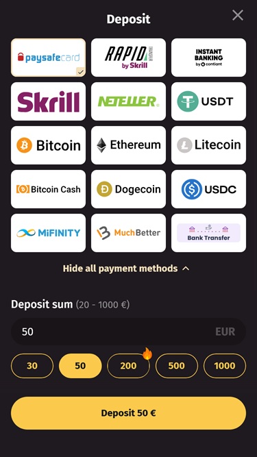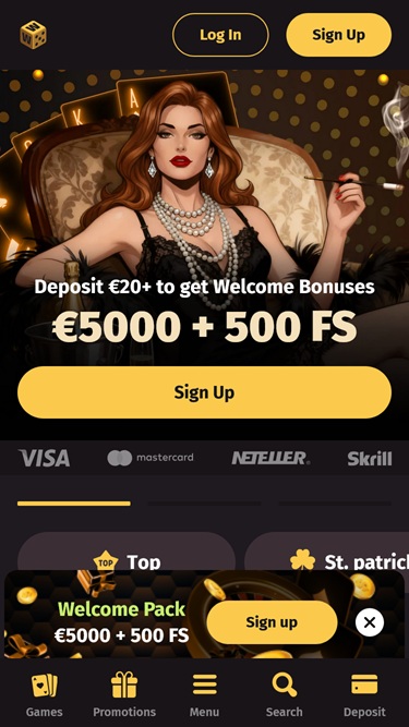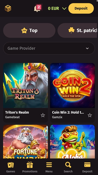 The top of the home page is reserved for a scrolling banner that features some of the most exciting promotions you can claim here. Below is a list of the most popular and newest games on the website, alongside some of the most played live-casino titles.
