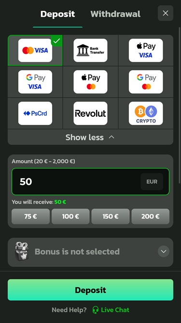 Apple Pay, Google Pay, Revolut, and other online banking services, as well as bank wire transfer, payment cards, and other options, are available for making deposits and withdrawals.