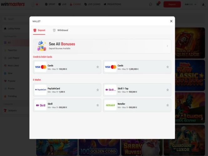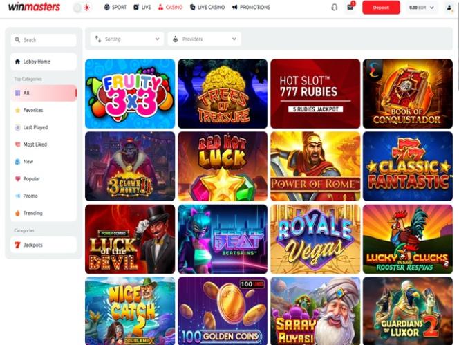 Winmasters Casino is powered by Microgaming, Net Entertainment, Playtech, 1x2gaming, Big Time Gaming, ELK Studios, Evolution Gaming, Ezugi, Genesis Gaming, iSoftBet, lightningboxgames, Play'n GO, playson, Relax Gaming, Thunderkick, Endorphina, Wazdan, Realistic Games, Betgames, Booming Games, Stakelogic, Pragmatic Play, Nolimit City, Felt Gaming, Red Tiger Gaming, Red Rake Gaming, Skillzzgaming, Fantasma Games, SYNOT Games, Kalamba, Revolver Gaming, Skywind, Spinmatic, Spadegaming, Triple Edge Studios, Northern Lights Gaming, Stormcraft Studios, Switch Studios, OneTouch, Electric Elephant Games, Pocket Games Soft, Dreamtech Gaming, All41 Studios, Gluck Games, Gameburger Studios, Pulse 8 Studios, Neon Valley Studios, Golden Rock Studios, Spearhead Studios, Swintt, SpinPlay Games, HungryBear Gaming, Real Dealer Studios, GONG Gaming, Blue Guru Games, Lady Luck Games, Buck Stakes Entertainment, Games Global, Amusnet Interactive, Wizard Games, 2by2 Gaming, Ash Gaming, Blueprint Gaming, CT Interactive, Leander Games, Merkur Gaming, Pariplay, Push Gaming, Tom Horn Gaming, Reel Time Gaming, Authentic Gaming, BF Games, Bally Wulff, Iron Dog Studio, Old Skool Studios, Foxium, Just For The Win, Storm Gaming Technology, PearFiction Studios, Wild Streak Gaming, Slingshot Studios, Fortune Factory Studios, Jade Rabbit Gaming, STHLM Gaming, 4ThePlayer, Gamevy, Crazy Tooth Studio, ReelPlay, Zonelock, Alchemy Gaming, Rarestone Gaming, Plank Gaming, Black Pudding Games, Snowborn Games, Hacksaw Gaming, Max Win Gaming, Gold Coin Studios, Half Pixel Studios, SilverBack Gaming, Aurum Signature Studios, Armadillo Studios, FlipLuck, Area Vegas, Leap Gaming, GoldenRace, Kiron, Wishbone Games, LiveG24, Print Studios, HammerTime Games, Four Leaf Gaming, INO Games, Nailed It! Games, Live 5, Neko Games, Reel Kingdom, Oros Gaming and JVL, and its casino games are provided through a web-based platform as well as through a mobile site.