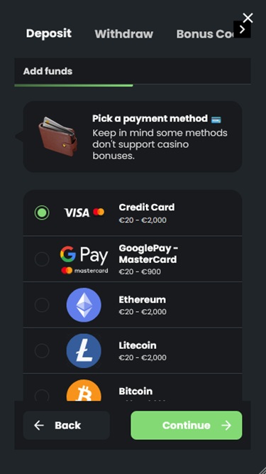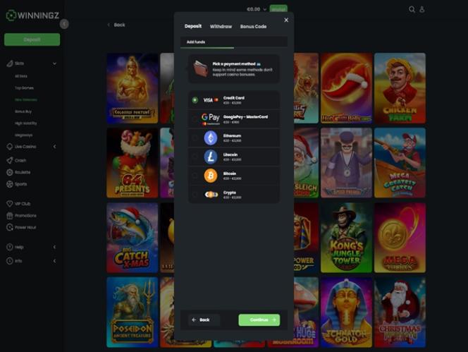 Winningz Casino offers various payment methods such as Bank Wire Transfer, Google Pay, Visa and MasterCard to name a few, as well as crypto options like Bitcoin, Bitcoin Cash, Cardano, Dogecoin, Ethereum, Litecoin, Ripple, Solana, Tether, Tron and USD Coin.