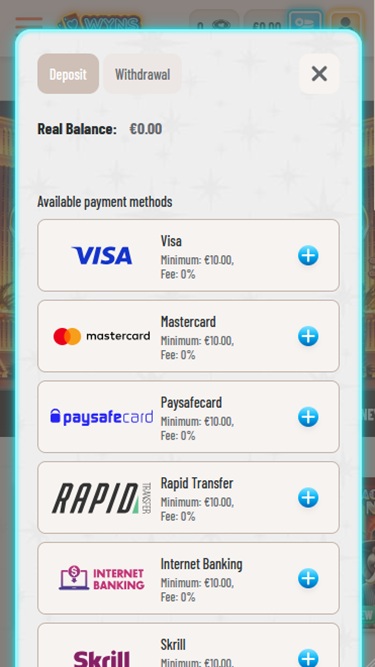 Wyns casino offers various payment methods such as MiFinity, Bank Wire Transfer, Neosurf, Nordea, Skrill, Netteler, Visa and MasterCard to name a few, as well as many crypto options like Bitcoin, Bitcoin Cash, Cardano, Dogecoin, Ethereum, Litecoin, Ripple, Tether and USD Coin.
