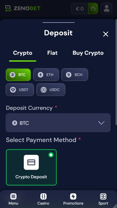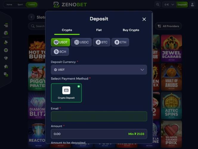 Zenobet is primarily a crypto-oriented online casino, meaning you can use several cryptocurrencies to manage your funds, including Bitcoin, Bitcoin Cash, Ethereum, USD Coin, and Tether. For traditional payment methods, the casino accepts Interac. Unfortunately, at the time of writing this review, the brand doesn’t accept credit, debit, or prepaid cards or digital wallets.