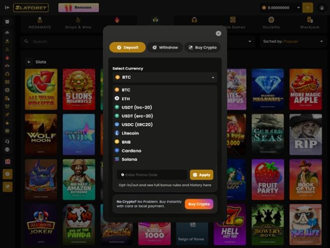 Zlatobet Casino adopts a modern approach to payment methods, as this gambling brand is primarily focused on providing players with numerous cryptocurrency options for both deposits and withdrawals, including Bitcoin, Cardano, Ethereum, Litecoin, Solana, USD Coin, and Tether.