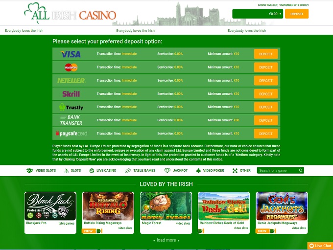The all irish casino is almost identical to the all australian casino, all british casino and adlercasino. I find this casino rather unspectacular. the available selection of games is relatively modest. The bonus offers as well. I have never deposited there and most likely will not in the future.