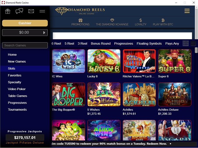 There are a healthy number of slots to play at Diamond Reels Casino, although most of the available games are video slots. The games are fairly standard, and if you have played at an RTG casino in the past you will surely recognize them. Progressive jackpots are also offered at Diamond Reels, and there are millions of dollars in prizes available at any given time.