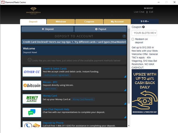 Banking options at Diamond Reels Casino