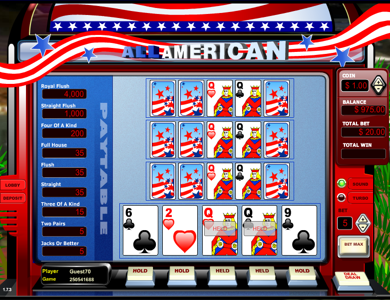 This is a table game version of the video poker game All American. The player may play one to five betting spots. Vista follows the same pay table as the video poker game, except a royal flush pays 250 instead of 800 per coin bet. This lowers the house edge from 96.27% to 95.12%.