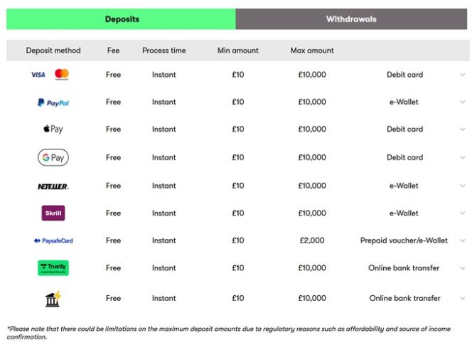 Traditional payment methods you can use are Apple Pay, BankID, CoDi, EPS, Euteller, Google Pay, Interac, Maestro, Visa, Mastercard, MuchBetter, Skrill, Neteller, Pay n Play, PayPal, Paysafecard, Payz, Sofort Banking, Swish, and Trustly.