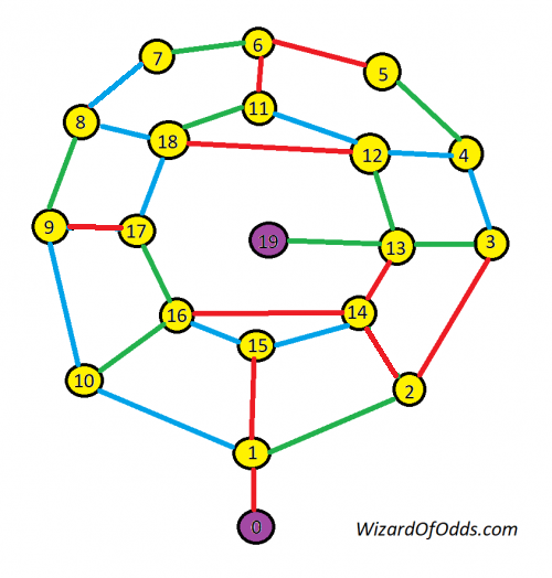 Your task is to get from square 0 to square 19. You may not take a path of the same color twice in a row. In other words, at every square you must change to a path of another color. No u-turns. What is the solution?