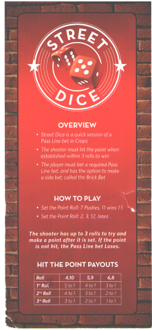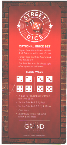 Street Dice is a dice game that debuted at the Downtown Grand casino in Las Vegas on May 16, 2014. It could loosely be described as a simplified version of craps, with just two bets and a maximum of four rolls to resolve a bet. At the Grand, the game is played outdoors with the dice cast inside a three-sided wood box, painted to look like an alley.