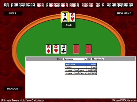 I'm proud to present my Ultimate Texas Hold 'Em® calculator. Put in any cards after the flop, river, or turn, and it will tell you the correct play and expected value.